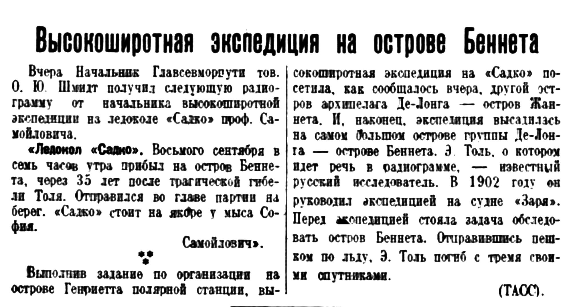 Выполнив задание по организации на острове Генриетта полярной станции, высокоширотная экспедиция на «Садко» посетила, как сообщалось вчера, другой остров архипелага Де-Лонга — остров Жаннета. И. наконец, экспедиция высадилась на самом большом острове группы Де-Лонга — острове Беннета. Э Толь, о котором идет речь в радиограмме, — известный русский исследователь. В 1902 году он руководил экспедицией на судне «Заря». Перед экспедицией стояла задача обследовать остров Беннета. Отравившись пешком по льду, Э. Толь погиб с тремя твоими спутниками.