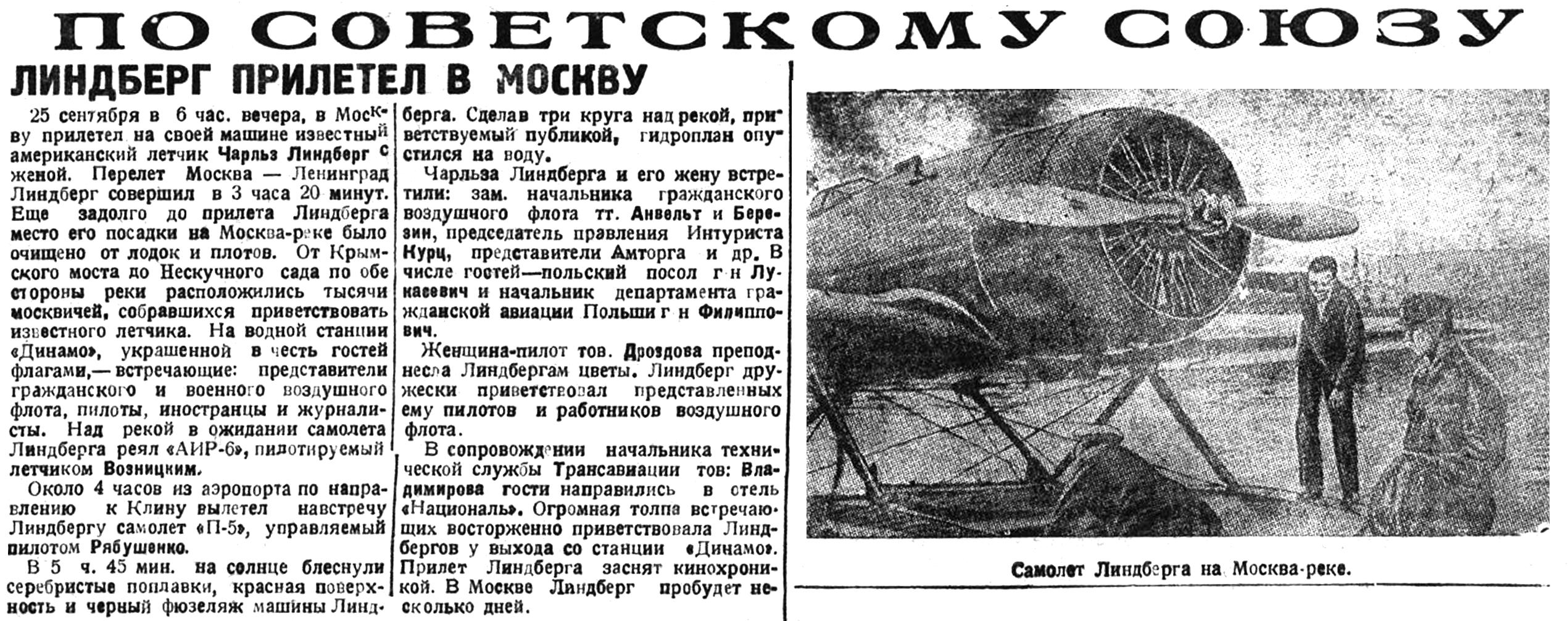 Линдберг выясняет возможность совершить перелет в Москву и сесть на Москва-реке.