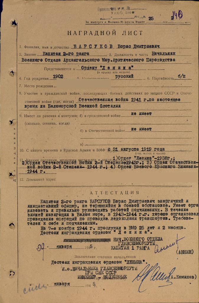 ХI-1943-по наст. время Нач. Военного Отд. Архангельского Мор. Арктического Пароходства Арханг. Мор. Арктич. Пароходство БВФ