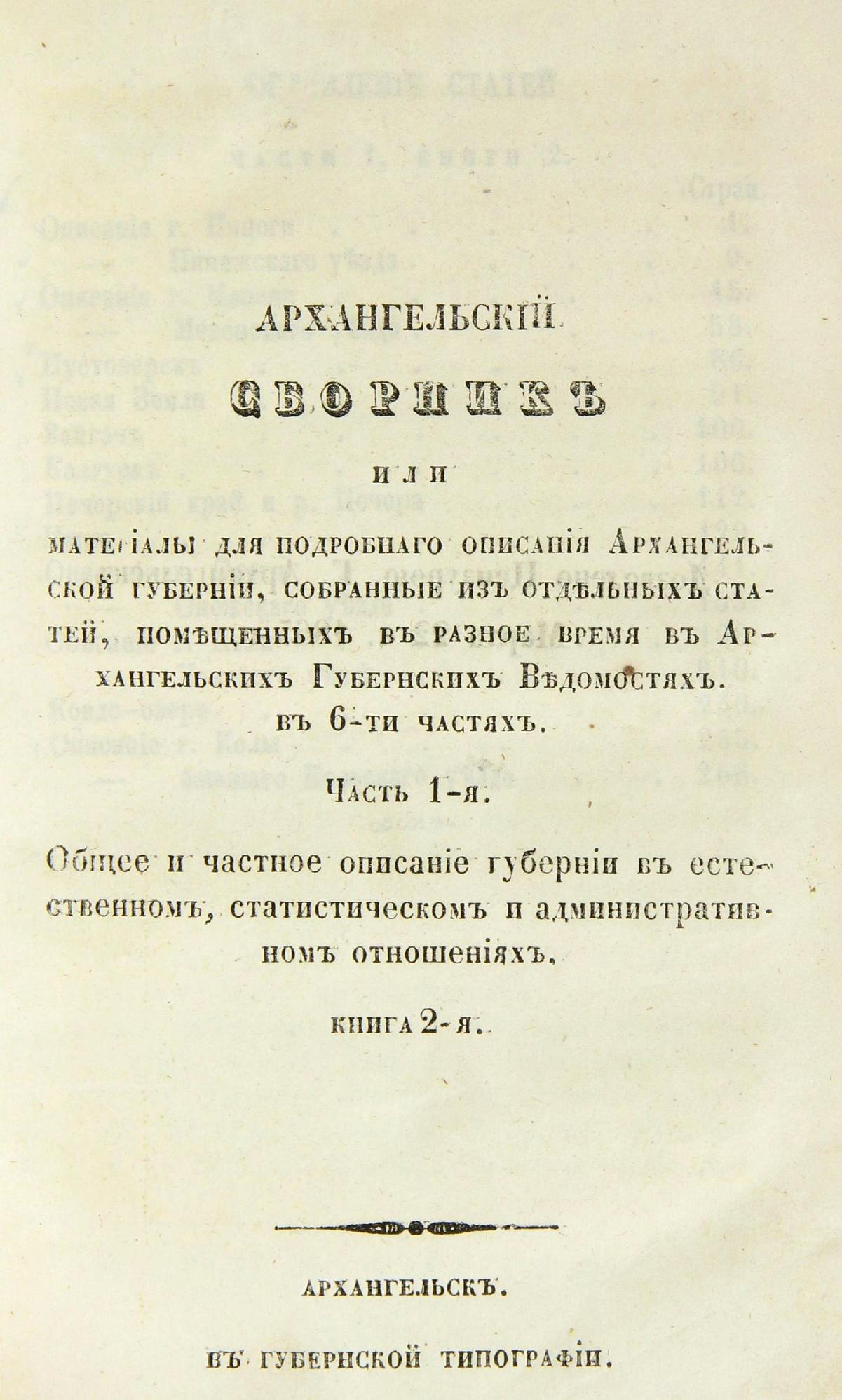 Архангельский сборник. Часть 1. Книга 2 .Архангельский сборник, или материалы для подробного описания Архангельской губернии, собранные из отдельных статей, помещенных в разное время в Архангельских губернских ведомостях: В 6-ти ч. — Архангельск: Губернская типография, 1865.