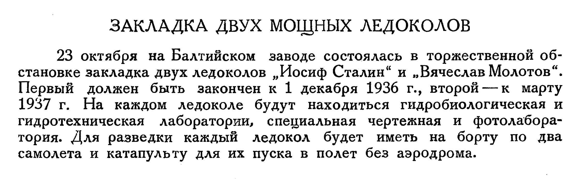 23 октября на Балтийском заводе состоялась в торжественной обстановке закладка двух ледоколов „Иосиф Сталин“ и „Вячеслав Молотов". Первый должен быть закончен к 1 декабря 1936 г., второй — к марту 1937 г. На каждом ледоколе будут находиться гидробиологическая и гидротехническая лаборатории, специальная чертежная и фотолаборатория. Для разведки каждый ледокол будет иметь на борту по два самолета и катапульту для их пуска в полет без аэродрома.