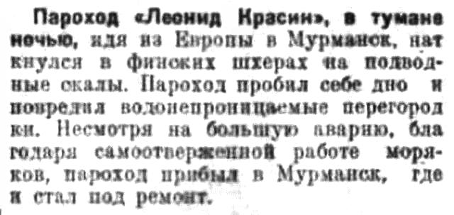 Пароход «Леонид Красин», в тумане ночью, идя из Европы в Мурманск, наткнулся в финских шхерах на подводные скалы.
