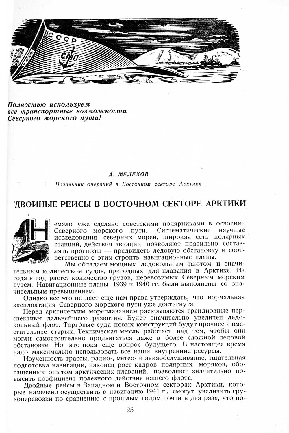 — В этом году судоходство на великой северной трассе откроется значительно раньше, чем в прошлые годы. Советские полярники должны проделать огромную работу, чтобы успешно выполнить решение XVIII партийного съезда о превращении Северного морского пути в нормально действующую водную магистраль, обеспечивающую планомерную связь европейской части СССР с Дальним Востоком. Навигации последних лет показали, что мы имеем все возможности для перехода от ранее практиковавшихся экспедиционных рейсов к регулярному плаванию судов по всей трассе.