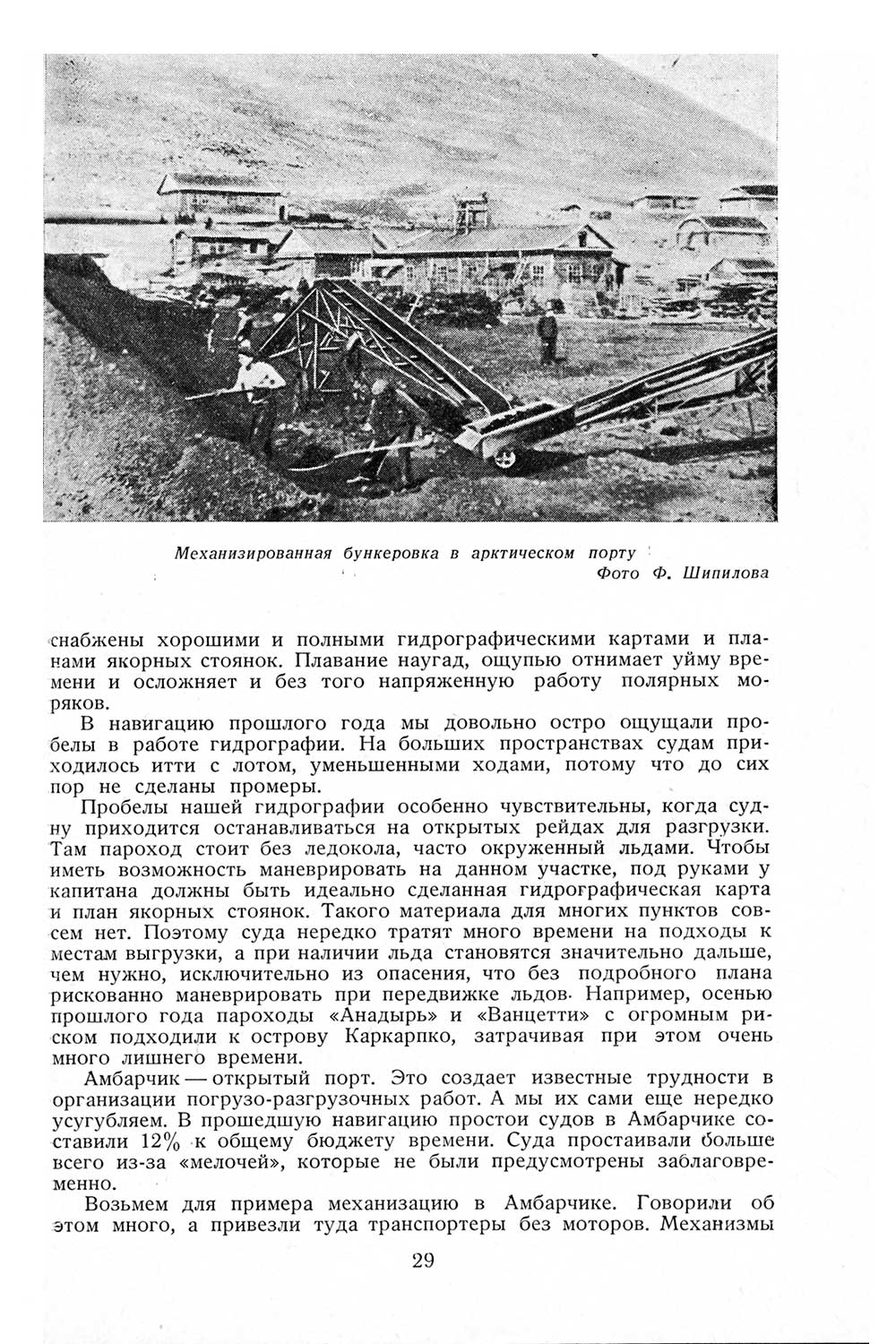 Предусмотрены все условия для обеспечения бесперебойной работы флота в период всей навигации. Для каждого судна, для каждого порта разработан точный график работы. В арктических портах установлены мощные механизмы, способные в несколько раз сократить сроки погрузки п выгрузки судов.