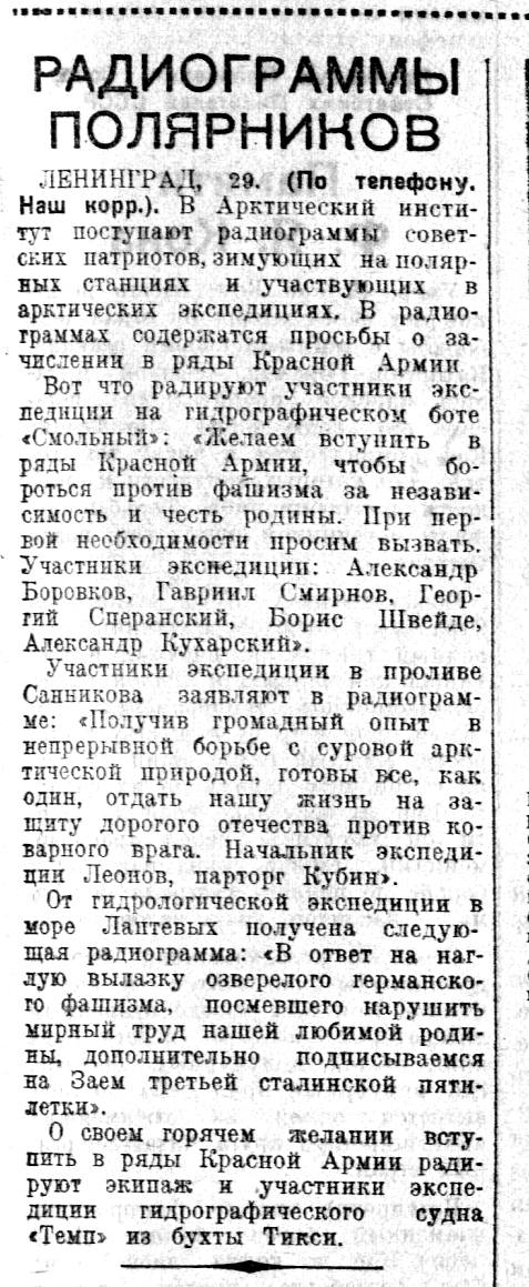 Радиограммы полярников//Вечерняя Москва (№177) 29 .07.1941