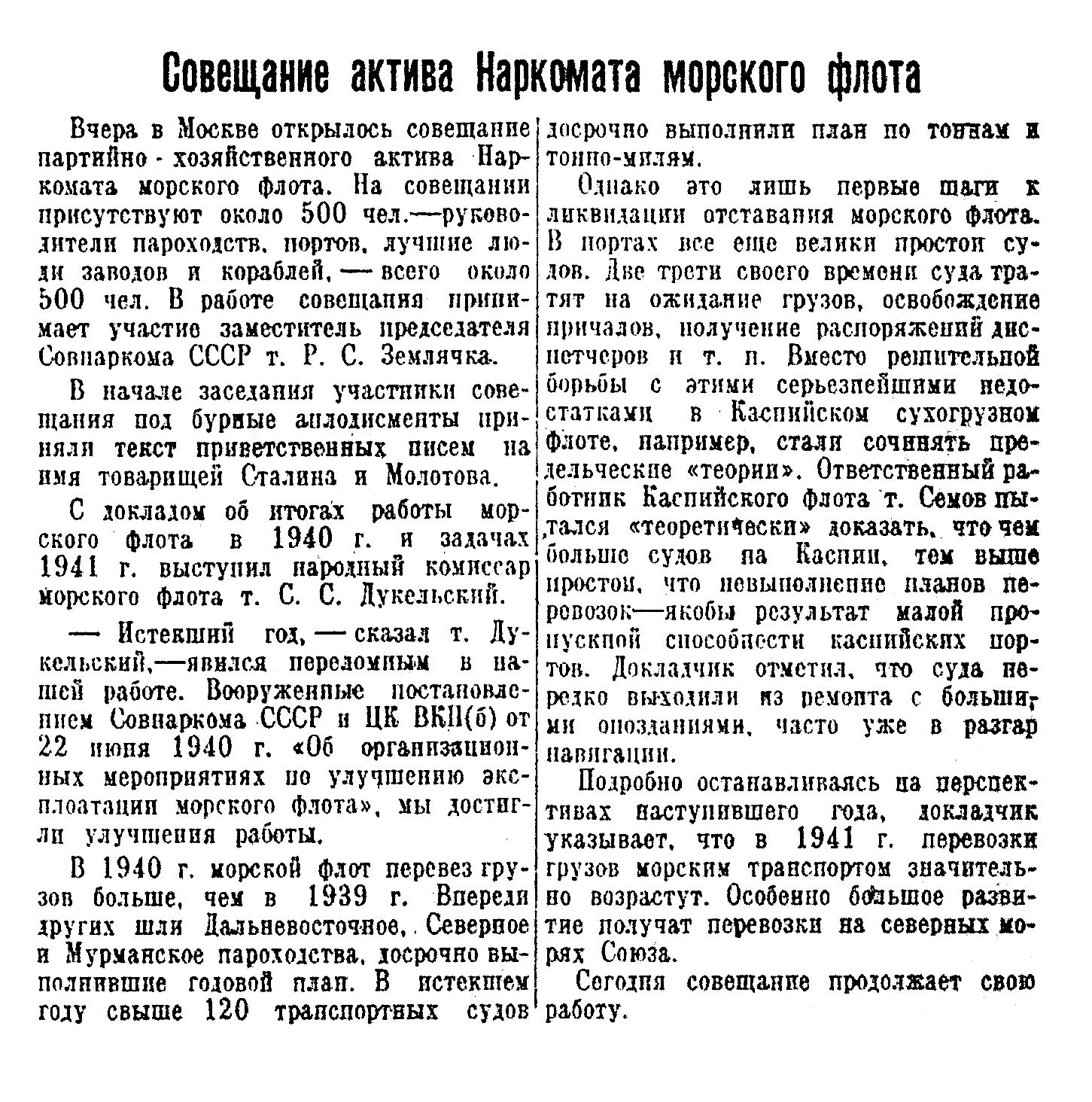 С докладом об итогах работы морского флота в 1940 г. и задачах 1941 г. выступил народный комиссар Морского флота т. С. С. Дукельский.
