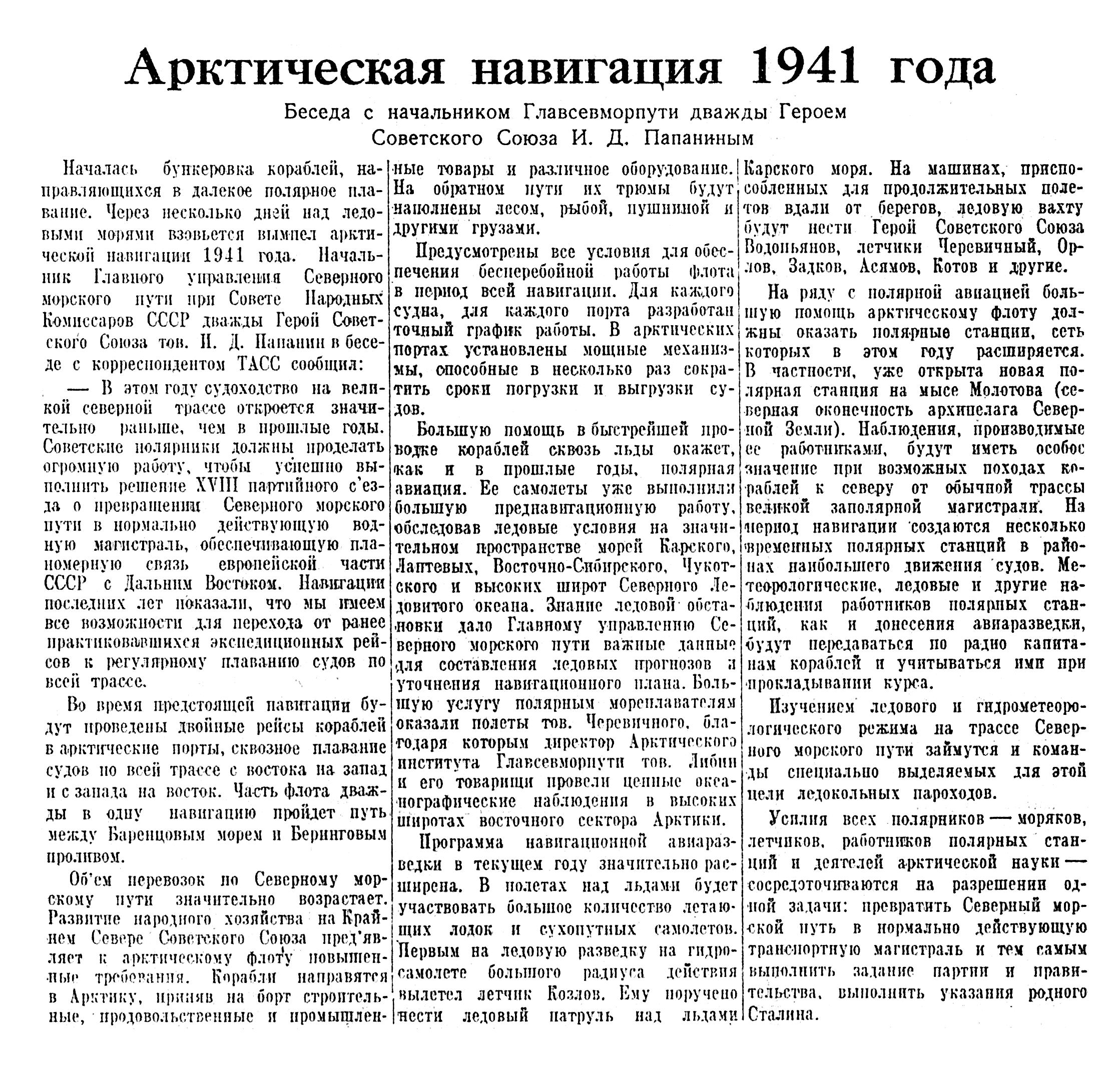 Началась бункеровка кораблей, направляющихся в далекое полярное плавание. Через несколько дней над ледовыми морями взовьется вымпел арктической навигации 1941 года. Начальник Главного управления Северного морского пути при Совете Народных Комиссаров СССР дважды Герой Советского Союза тов. И. Д. Папанин в беседе с корреспондентом ТАСС сообщил: