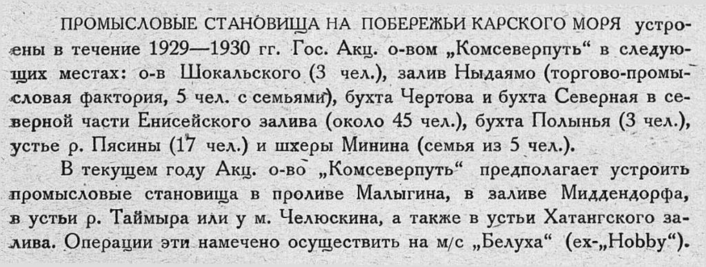 В текущем году Акц. о-во „Комсеверпуть" предполагает устроить промысловые становища в проливе Малыгина, в заливе Миддендорфа, в устьи р. Таймыра или у м. Челюскина, а также в устьи Хатангского залива. Операции эти намечено осуществить на м/с „Белуха" (ex-„Hobby“).