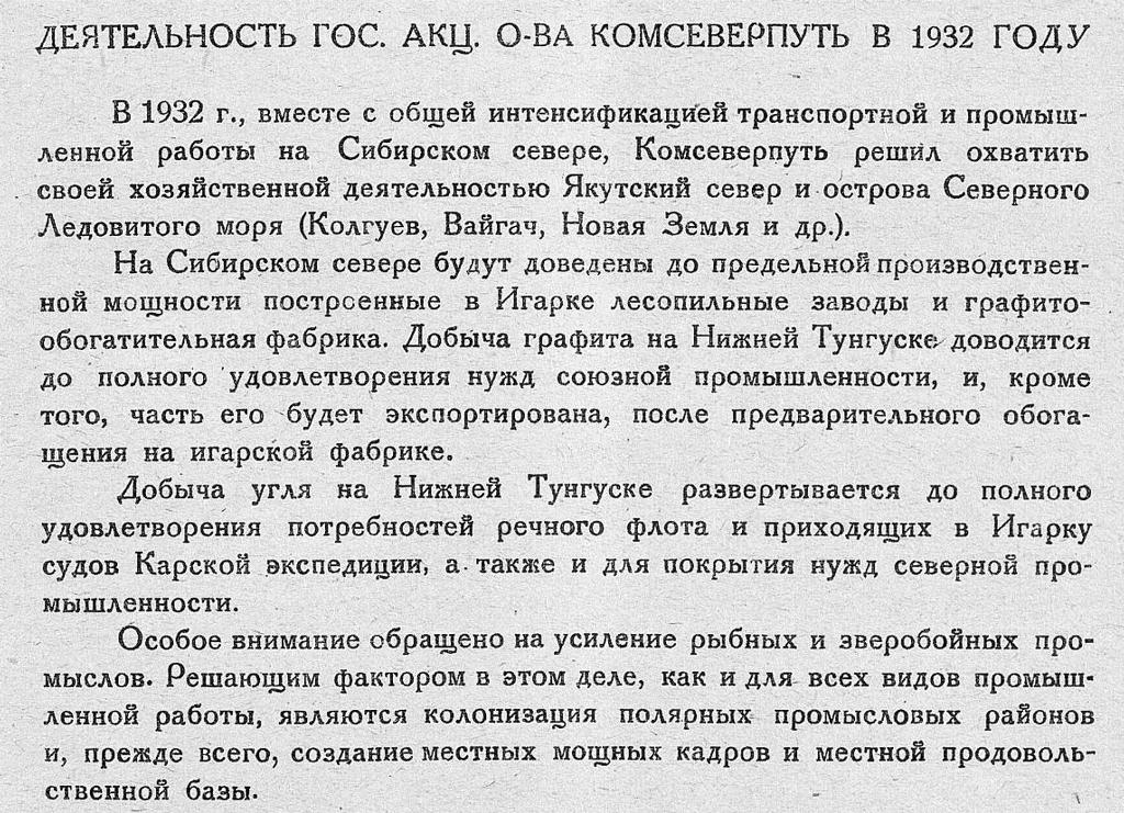 В 1932 г., вместе с общей интенсификацией транспортной и промышленной работы на Сибирском севере, Комсеверпуть решил охватить своей хозяйственной деятельностью Якутский север и острова Северного Ледовитого моря (Колгуев, Вайгач, Новая Земля и др.).