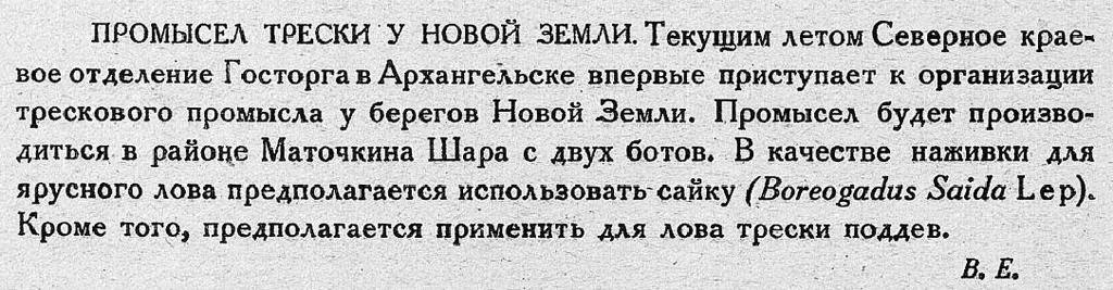 ПРОМЫСЕЛ ТРЕСКИ У НОВОЙ ЗЕМЛИ. Текущим летом Северное краевое отделение Госторга в Архангельске впервые приступает к организации трескового промысла у берегов Новой Земли. Промысел будет производиться в районе Маточкина Шара с двух ботов. В качестве наживки для ярусного лова предполагается использовать сайку (Boreogadus Saida Lep). Кроме того, предполагается применить для лова трески поддев.