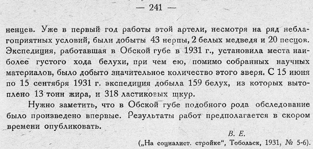 В 1930—1931 гг. Уральский Гос. рыбтрест производил научнопромысловые исследования в районе Обской губы и на п-ове Ямал. Экспедиция, зимовавшая (в 1930/31 г.) на северной оконечности Ямала, установила полную рентабельность зимнего промысла нерпы, белого медведя и песца. Достижением этой экспедиции является также создание небольшой зверобойной артели, состоящей целиком из ямальских ненцев. Уже в первый год работы этой артели, несмотря на ряд неблагоприятных условий, были добыты 43 нерпы, 2 белых медведя и 20 песцов. Экспедиция, работавшая в Обской губе в 1931 г., установила места наиболее густого хода белухи, при чем ею, помимо собранных научных материалов, было добыто значительное количество этого зверя. С 15 июня по 15 сентября 1931 г. экспедиция добыла 159 белух, из которых вытоплено 13 тонн жира, и 318 ластиковых шкур.