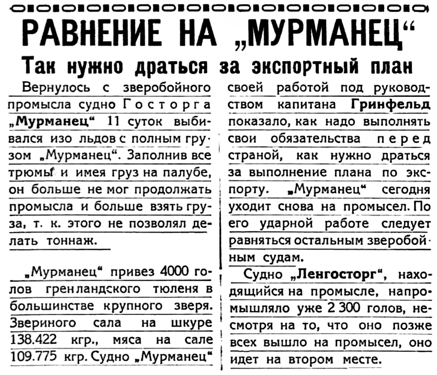 своей работой под руководством капитана Гринфельд показало, как надо выполнять свои обязательства перед страной, как нужно драться за выполнение плана по экспорту. "Мурманец" сегодня уходит снова на промысел. По его ударной работе следует равняться остальным зверобойным судам.