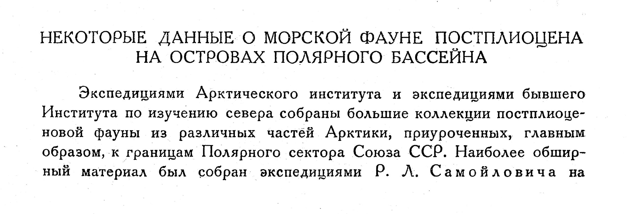 Экспедициями Арктического института и экспедициями бывшего Института по изучению севера собраны большие коллекции постплиоценовой фауны из различных частей Арктики, приуроченных, главным образом, к границам Полярного сектора Союза ССР. Наиболее обширный материал был собран экспедициями Р. Л. Самойловича на