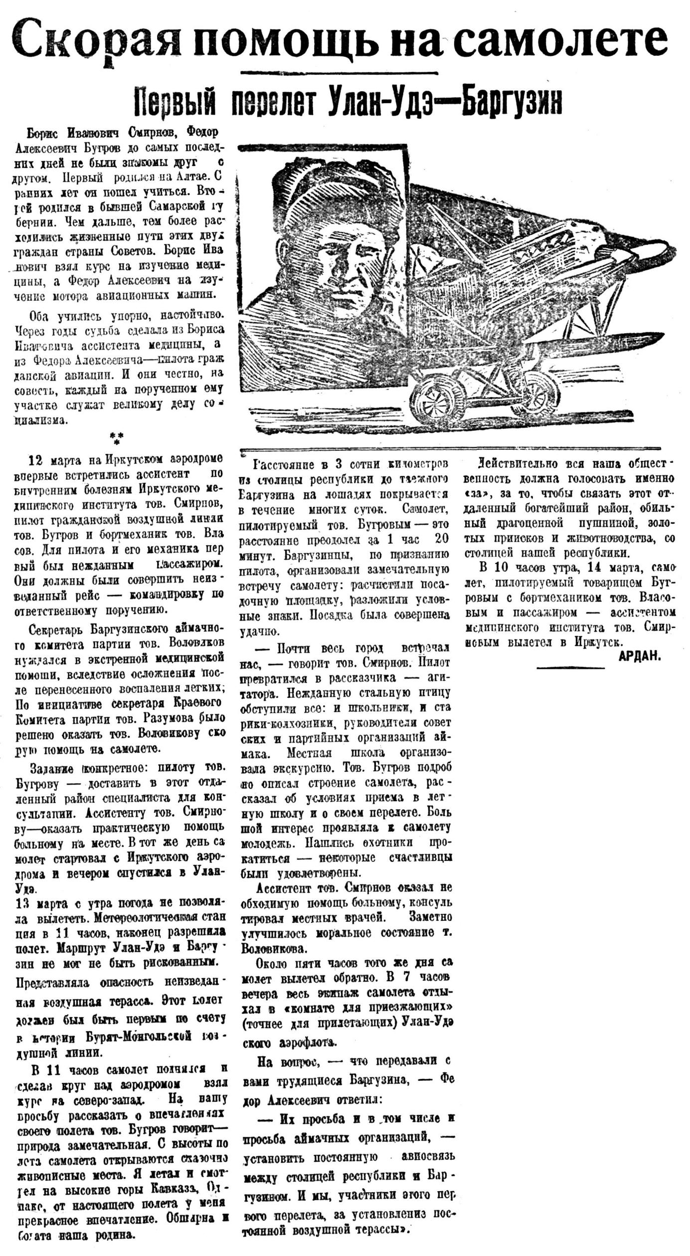 В 10 часов утра, 14 марта, самолет, пилотируемый товарищем Бугровым с бортмехаником тов. Власовым и пассажиром — ассистентом медицинского института тов. Смирновым вылетел в Иркутск.