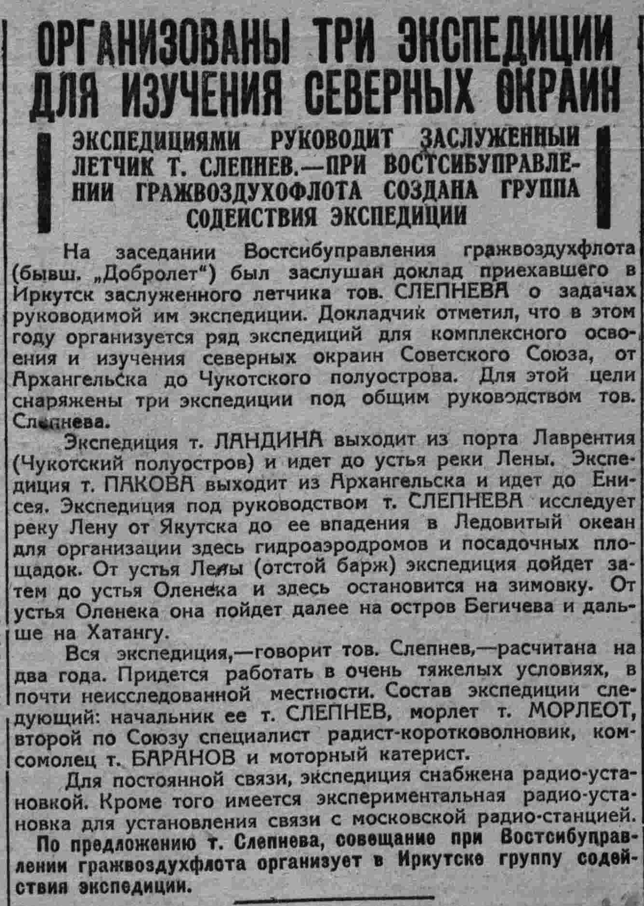 Скверно дело со снабжением Северной экспедиции по изысканию мест для посадочных площадок. Работать экспедиции приходится в тяжелых условиях, в лесах, болотах и т. д. Экспедиция обращалась в горснаб, но там не пошли навстречу. Отпускаемое количество продуктов не удовлетворяет работающих в лесах. Аэродром просил у горснаба полотна для устройства воздухопоказателей (колбаса) — тоже отказано. Даже такого пустяка, как извести, начальник аэродрома не мог достать у наших организаций. А известь крайне необходима для обозначения знаков.