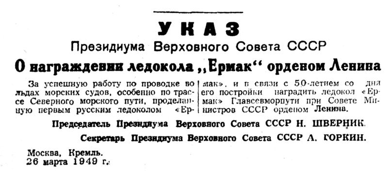 За успешную работу по проводке во льдах морских судов, особенно по трассе Северного морского пути, проделанную первым русским ледоколом «Ермак», и в связи с 50-летнем со дня его постройки наградить ледокол «Ермак» Главсевморпути при Совете Министров СССР орденом Ленина.