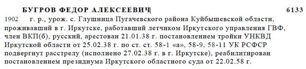 1902 г. р., урож. с. Глушница Пугачевского района Куйбышевской области, проживавший в г. Иркутске, работавший летчиком Иркутского управления ГВФ, член ВКП(б), русский, арестован 21.01.38 г. постановлением тройки УНКВД Иркутской области от 25.02.38 г. по ст. ст. 58-1 «а», 58-9, 58-11 УК РСФСР подвергнут расстрелу (исполнено 27.02.38 г. в г. Иркутске), реабилитирован постановлением президиума Иркутского областного суда от 22.02.58 г