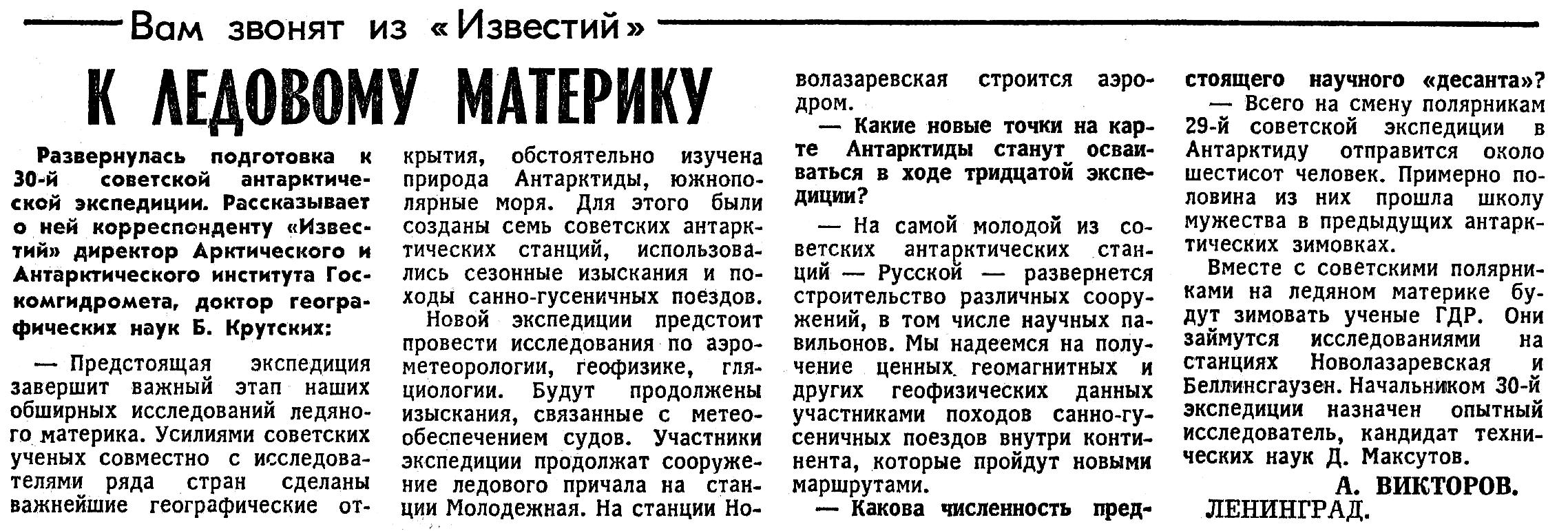 Развернулась подготовка к 30-й советской антарктической экспедиции. Рассказывает о ней корреспонденту «Известий» директор Арктического и Антарктического института Госкомгидромета, доктор географических наук Б. Крутских: