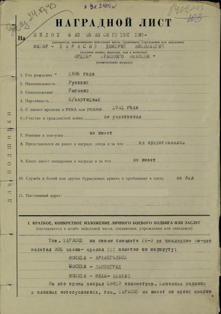 Летчик ТАРАСОВ Д. Н. с начала Отечественной войны летал на самолетах : ТБ-3, Р-6, СИ-47.