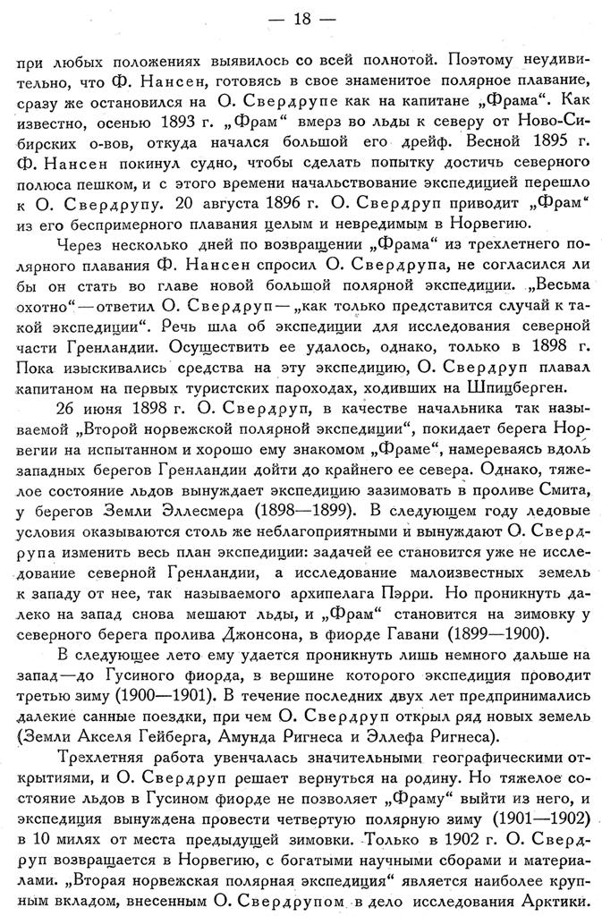 26 июня 1898 г. О. Свердруп, в качестве начальника так называемой „Второй норвежской полярной экспедиции", покидает берега Норвегии на испытанном и хорошо ему знакомом „Фраме“, намереваясь вдоль западных берегов Гренландии дойти до крайнего ее севера. Однако, тяжелое состояние льдов вынуждает экспедицию зазимовать в проливе Смита, у берегов Земли Эллесмера (1898—1899). В следующем году ледовые условия оказываются столь же неблагоприятными и вынуждают О. Свердрупа изменить весь план экспедиции: задачей ее становится уже не исследование северной Гренландии, а исследование малоизвестных земель к западу от нее, так называемого архипелага Пэрри. Но проникнуть далеко на запад снова мешают льды, и „Фрам" становится на зимовку у северного берега пролива Джонсона, в фиорде Гавани (1899—1900).