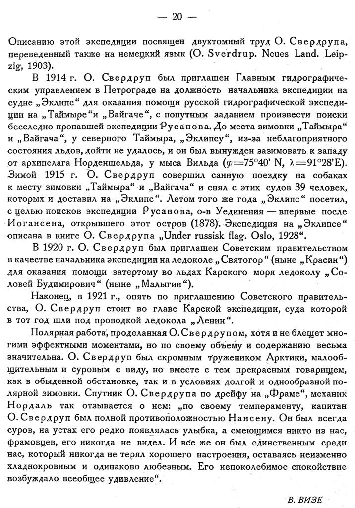 Наконец, в 1921 г., опять по приглашению Советского правительства, О. Свердруп стоит во главе Карской экспедиции, суда которой в тот год шли под проводкой ледокола „Ленин".