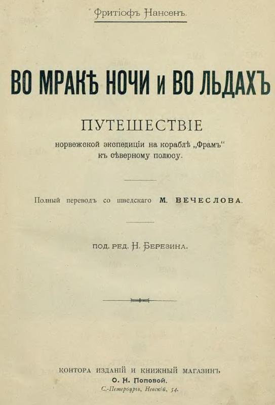Нансен Ф., "Во мраке ночи и во льдах. Путешествие норвежской экспедиции на корабле "Фрам" к Северному полюсу." - Полный перевод со шведского М. Вечеслова, Санкт-Петербург, 1898.