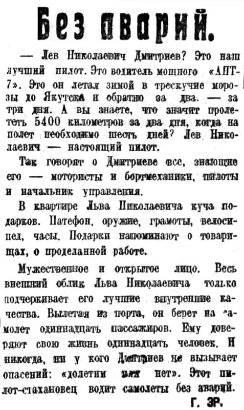 — Лев Николаевич Дмитриев? Это наш лучший пилот. Это водитель мощного «АНТ-7». Это он летал зимой в трескучие морозы до Якутска и обратно за два — за три дня. А вы знаете, что значит пролететь 5400 километров за два дня, когда на полет необходимо шесть дней? Лев Николаевич — настоящий пилот.