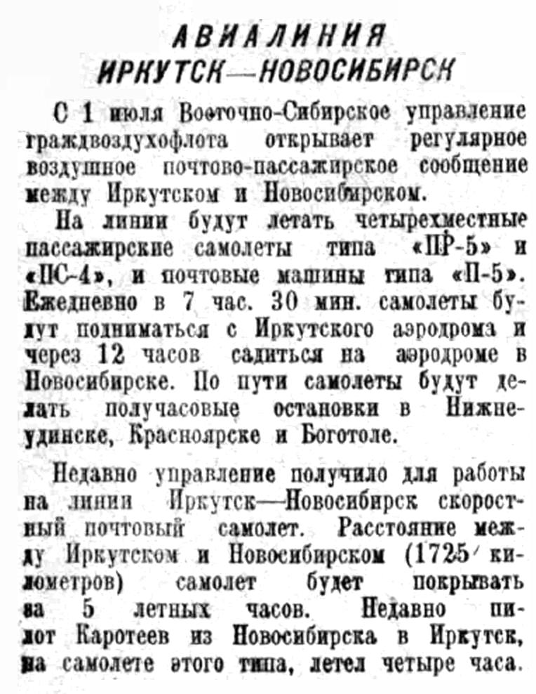 Значительно улучшилось техническое оснащение наших воздушных линий. Увеличилась грузоподъёмность машин. Налажена диспетчерская служба и техническая связь. С будущего года каждый самолет будет радиофицирован. Все идет к тому, что в скором времени восточносибирские воздушные линии будут иметь первоклассное оснащение. Это обеспечит полеты днем и ночью, зимой и летом, в самые отдаленные точки края. Уже сейчас в летнее время рейс Иркутск — Якутск совершается многими нашими пилотами в одни сутки против двух с половиной в прошлые годы.