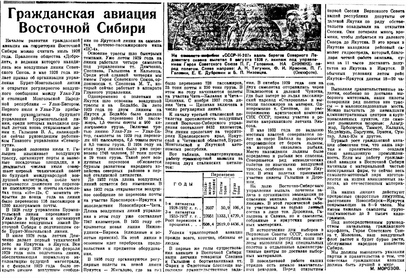 Успехи советской авиации видны на примере нашего края. Давно-ли самолет не только для сибирских деревень, но и некоторых городов был диковиной. А ныне десятки воздушных дорог вдоль и поперек пересекают край. Транспортная авиация Восточной Сибири, играющая сейчас огромную культурно-экономическую роль в народном хозяйстве края, является детищем передовой социалистической промышленности.