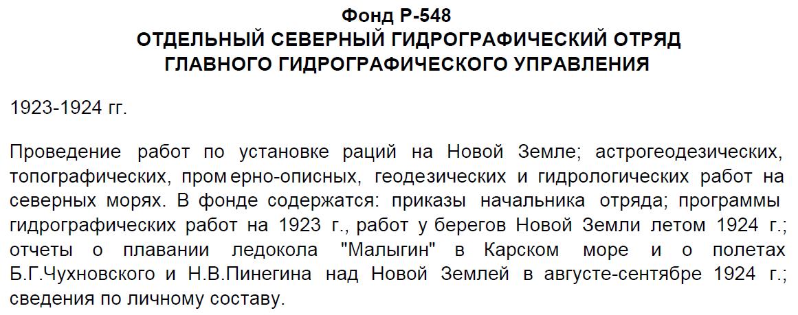 В документах фонда содержатся сведения о гидрографических работах на Севере в 1923-1924 гг, отчеты о плавании ледокола "Малыгин" в Карском море и полетах Б. Чухновского над Новой Землей, постройке радиостанций на Новой Земле, сформировании Северной гидрографической экспедиции и др.