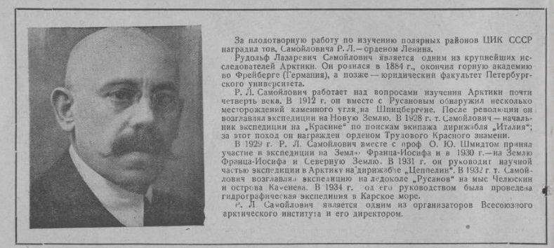 НОВЫЙ СОСТАВ ДИРЕКЦИИ АРКТИЧЕСКОГО ИНСТИТУТА. В связи с назначением проф. О. Ю. Шмидта начальником Главного Управления Северного морского пути, директором Всесоюзного Арктического института назначается проф. Р. Л. Самойлович и его заместителями: проф. В. Ю. Визе (первым заместителем), Н. Н. Урванцев и И. А. Копусов.