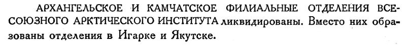 АРХАНГЕЛЬСКОЕ И КАМЧАТСКОЕ ФИЛИАЛЬНЫЕ ОТДЕЛЕНИЯ ВСЕСОЮЗНОГО АРКТИЧЕСКОГО ИНСТИТУТА ликвидированы. Вместо них образованы отделения в Игарке и Якутске.