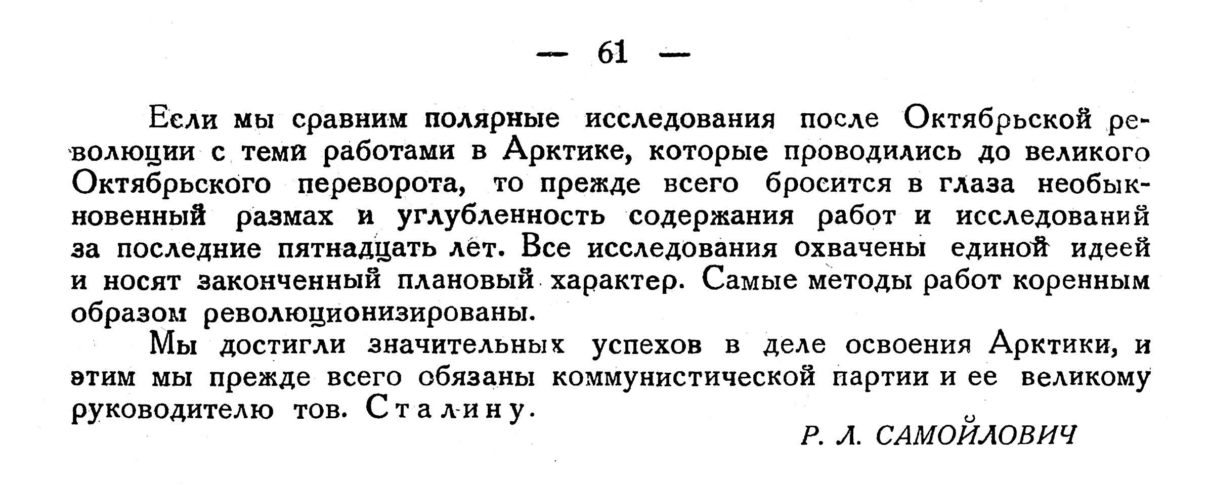 Если мы сравним полярные исследования после Октябрьской революции с теми работами в Арктике, которые проводились до великого Октябрьского переворота, то прежде всего бросится в глаза необыкновенный размах и углубленность содержания работ и исследований за последние пятнадцать лет. Все исследования охвачены единой идеей и носят законченный плановый характер. Самые методы работ коренным образом революционизированы.