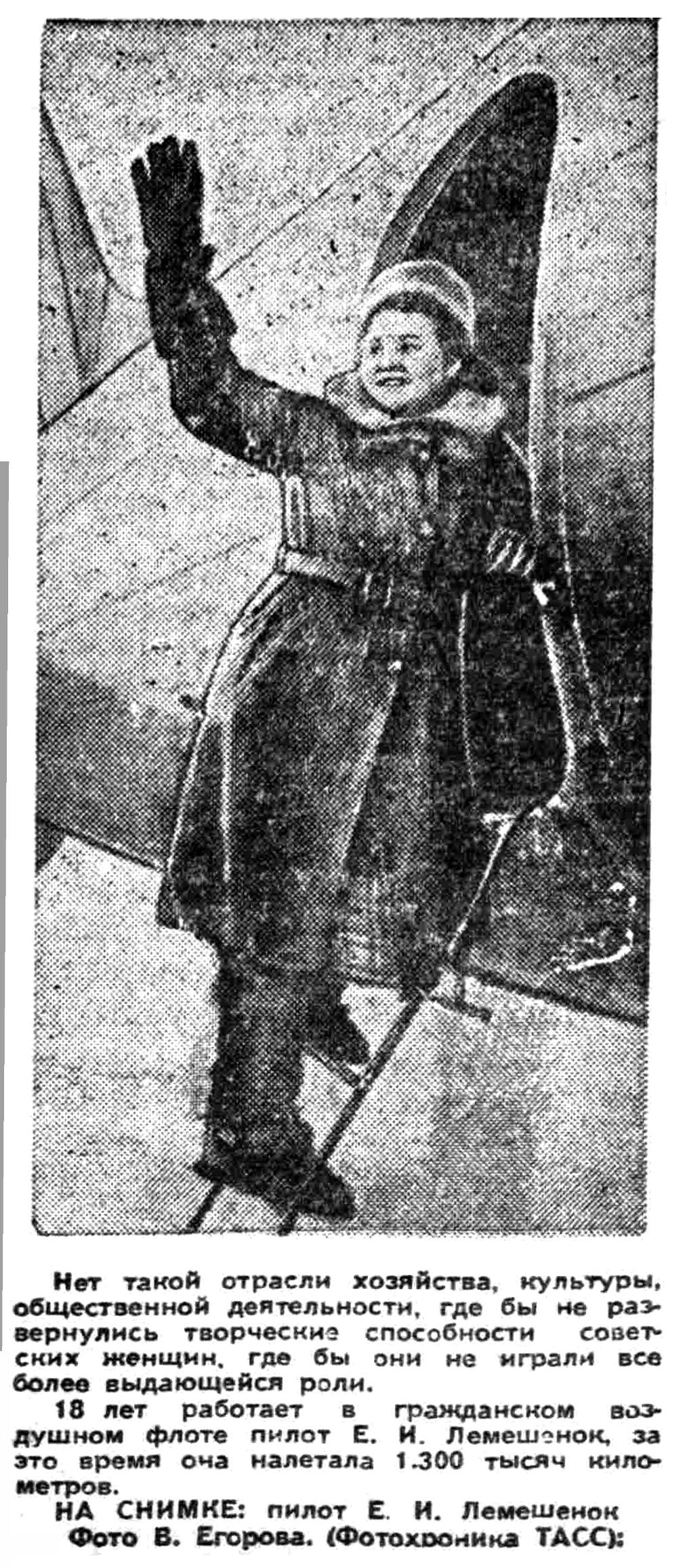 Гражданский воздушный флот — детище советской власти. Широкое и многообразное применение в народном хозяйстве гражданский флот нашел в годы сталинских пятилеток. На основе роста промышленности гражданский воздушный флот под повседневным вниманием товарища Сталина превратился в мощную отрасль народного хозяйства, стал играть огромную роль в развитии производительных сил нашей страны, особенно отдаленных северных районов Сибири и Востока. Богатства Востока и Сибири все полнее становятся на службу государства и в этом немалая заслуга гражданского воздушного флота.
