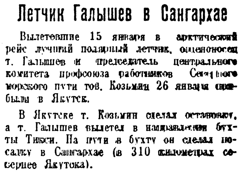 Вылетевшие 15 января в арктический рейс лучший полярный летчик, орденоносец т. Галышев и председатель центрального комитета профсоюза работников Cеверного морского пути тов. Козьмин 26 января прибыли в Якутск.
