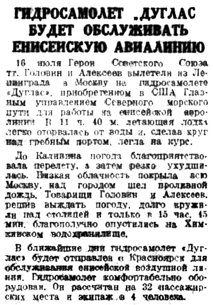 15 июля Герои Советского Союза тт. Головин и Алексеев вылетели из Ленинграда в Москву на гидросамолете «Дуглас», приобретенном в США Главным управлением Северного морского пути для работы на енисейской аэролинии. В 11 ч. 40 м. летающая лодка легко оторвалась от воды и, сделав круг над гребным портом, легла на курс.