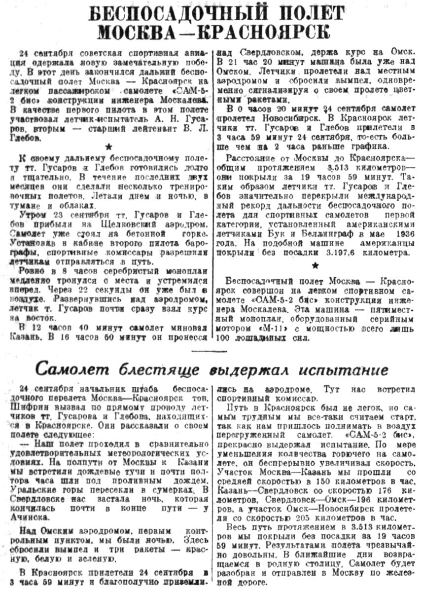 24 сентября советская спортивная авиация одержала новую замечательную победу. В этот день закончился дальний беспосадочный полет Москва — Красноярск на легком пассажирском самолете «CAM-5-2 бис» конструкции инженера Москалева. В качестве первого пилота в этом полете участвовал летчик-испытатель А. Н. Гусаров. вторым — старший лейтенант В. Л. Глебов.
