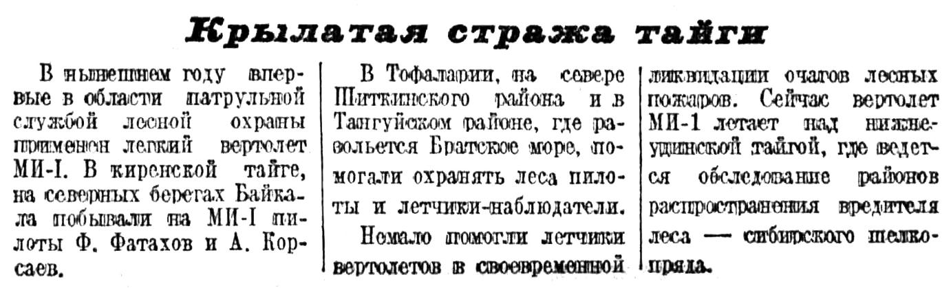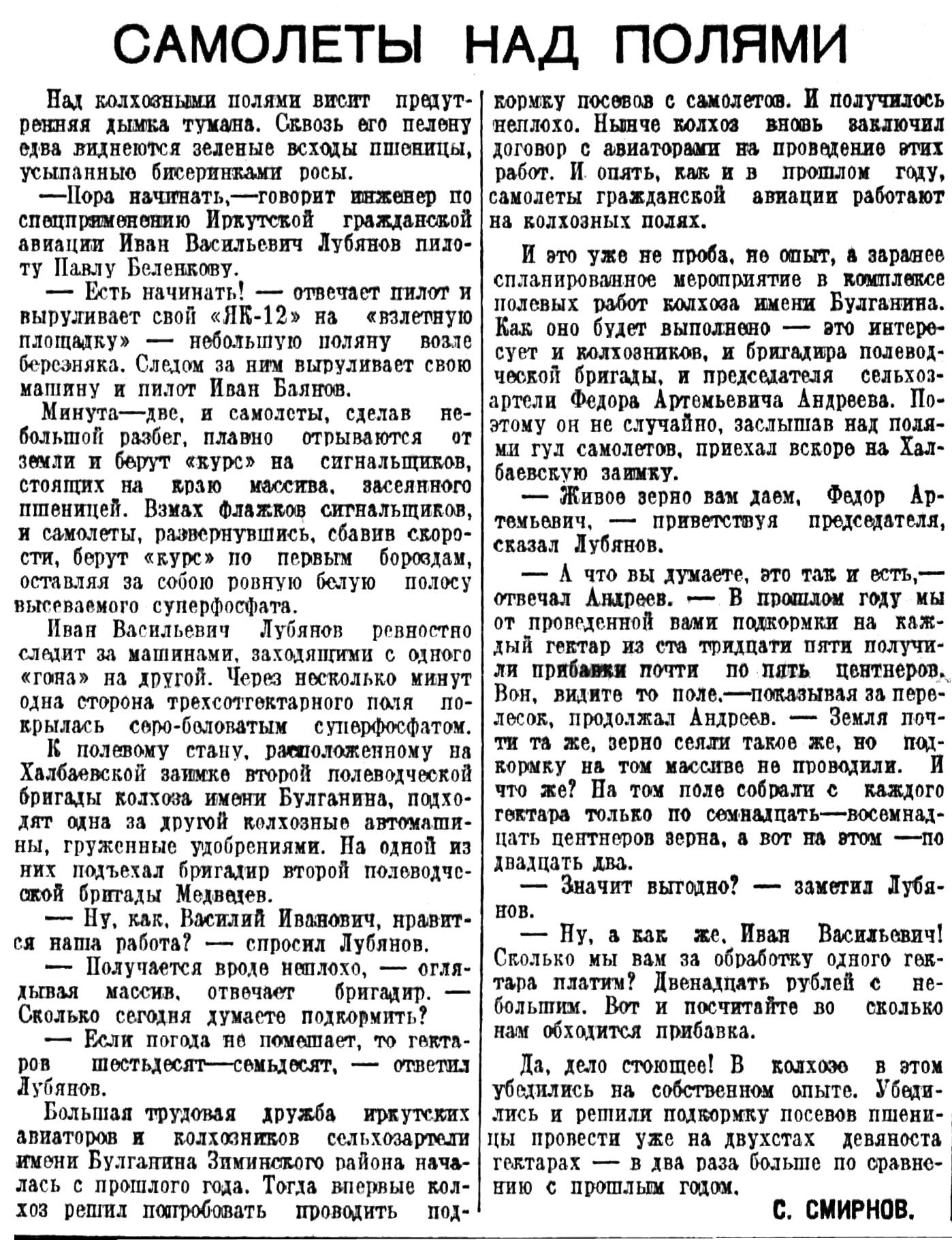 Четко и слаженно работает один из передовых экипажей подразделения спецприменения — экипаж командира самолета Бориса Федоровича Коржа. В колхозах его называют «крылатым хлеборобом». Экипаж Коржа нынешней весной с воздуха подкормил без малого 2000 гектаров озимых и яровых посевов в Эхирит-Булагатском и Усольском районах, более 7000 гектаров посевов протравил дустами в колхозах Баяндаевского и Качугского районов, достигнув при этом высокой производительности полетов.