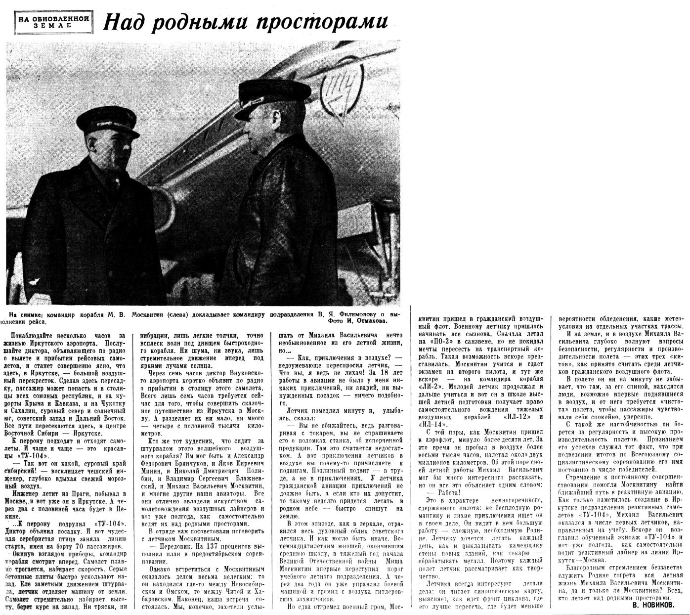 На снимке: (слева направо) командиры кораблей «ТУ-104» Иркутского подразделения реактивных самолетов, налетавшие по три миллиона километров — А. Н. Егоров, А. Я. Алетин, А. Ф. Брянчуков.