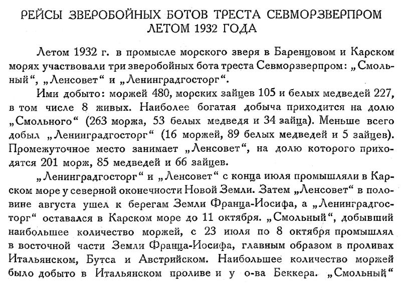 Летом 1932 г. в промысле морского зверя в Баренцовом и Карском морях участвовали три зверобойных бота треста Севморзверпром: „Смольный", „Ленсовет" и „Ленинградгосторг".