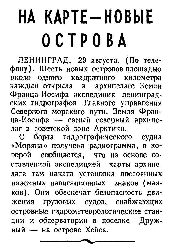 С борта гидрографического судна «Моряна» получена радиограмма, в которой сообщается, что на основе составленной экспедицией карты архипелага там начата установка постоянных наземных навигационных знаков (маяков). Они обеспечат безопасность движения грузовых судов, снабжающих островные гидрометеорологические станции и обсерватории в поселке Дружный — на острове Хейса.
