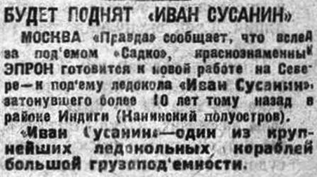 МОСКВА «Правда» сообщает, что вслед за подъемом "Садко», краснознаменный ЭПРОН готовится к новой работе на Севере - к подъему ледокола «Иван Сусанин» затонувшего более 10 лет тому назад в районе Индиги (Канинский полуостров), «Иван Сусанин» — один из крупнейших ледокольных, кораблей большой грузоподъемности.