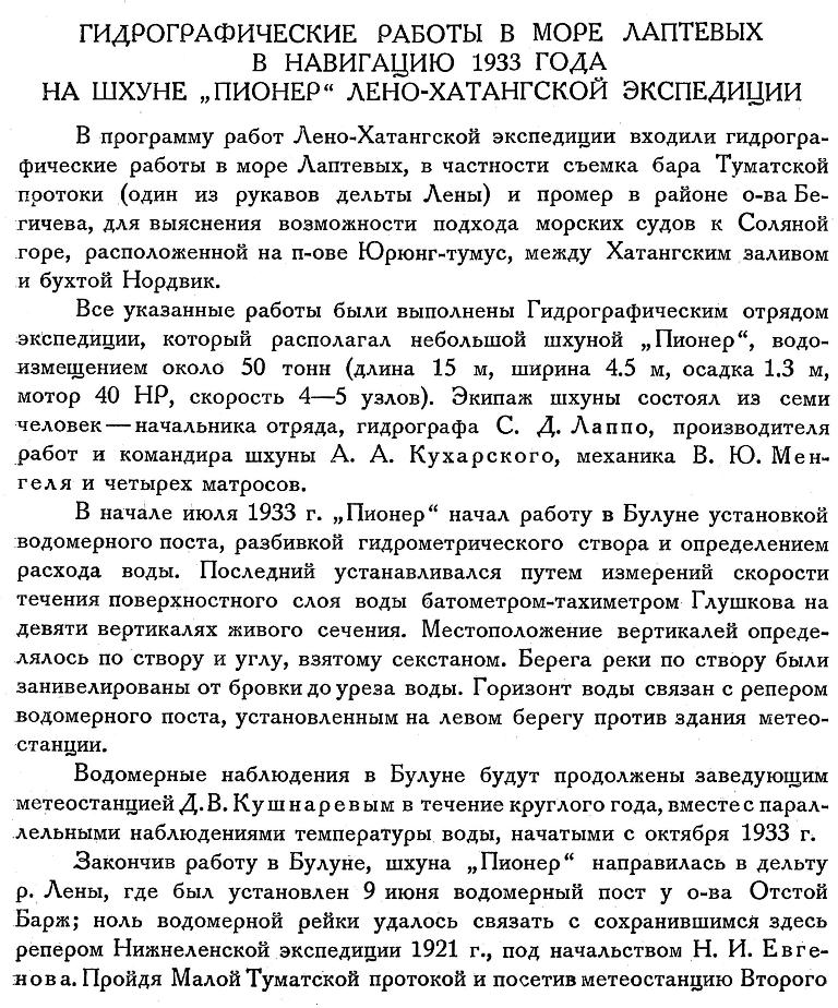 ГИДРОГРАФИЧЕСКИЕ РАБОТЫ В МОРЕ ЛАПТЕВЫХ В НАВИГАЦИЮ 1933 ГОДА НА ШХУНЕ „ПИОНЕР“ ЛЕНО-ХАТАНГСКОЙ ЭКСПЕДИЦИИ