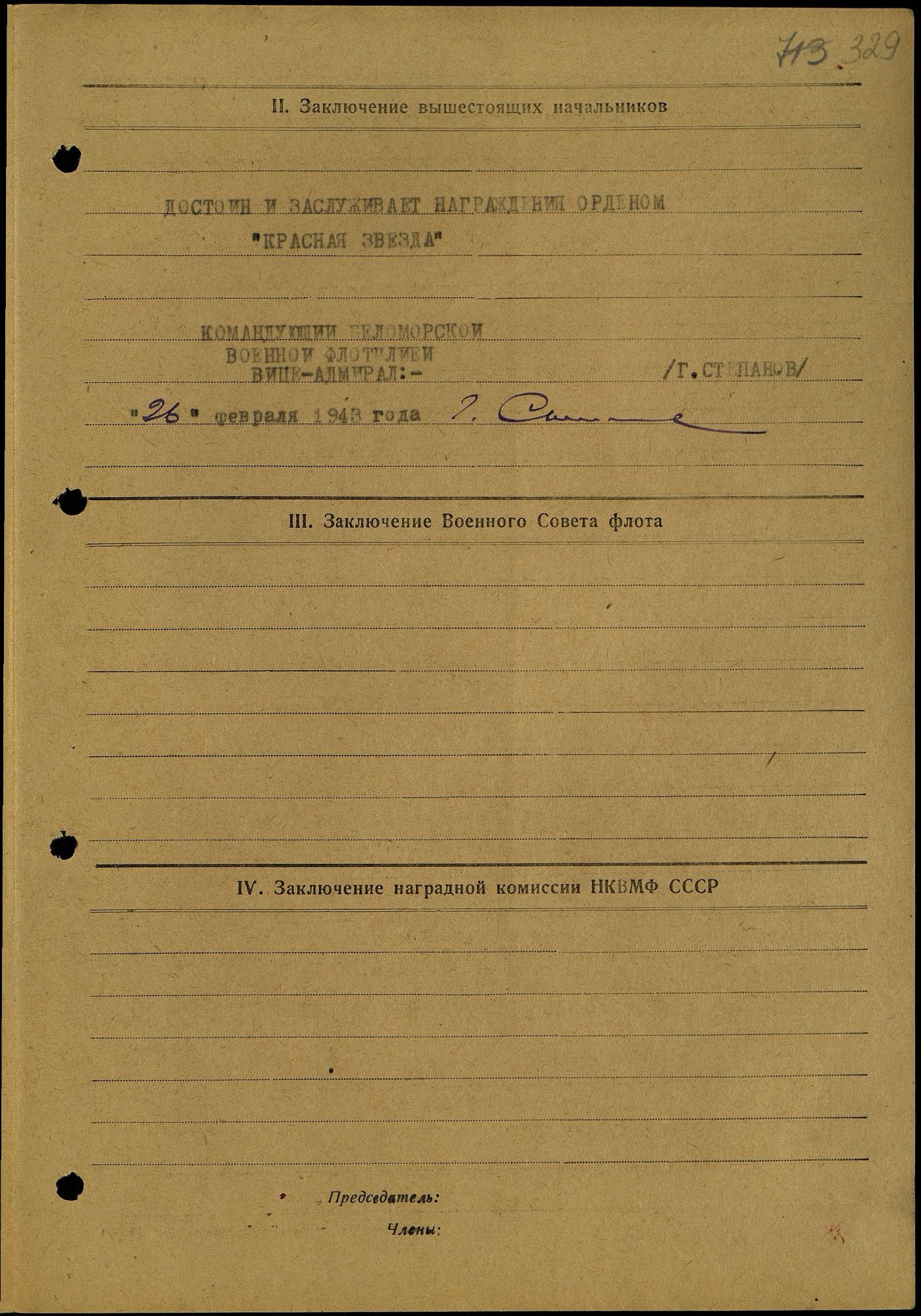За самоотверженную работу по гидрографическому обеспечению боевых объектов и кораблей Б.Ф. и С.Ф., образцовое выполнение оперативных и плановых заданий и проявленные при этом доблесть и мужество достоин награждения медалью "ЗА БОЕВЫЕ ЗАСЛУГИ".
