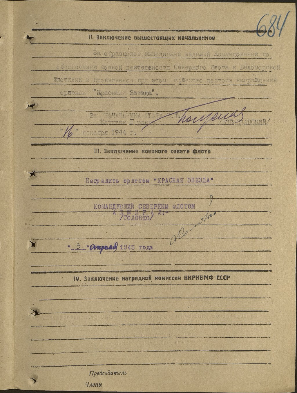 1. 1942 и 1943 г.г. по заданию Штаба С.Ф. производил топографическую съемку района Иоканкской военно-морской базы. Работал на пересеченной горной местности, будучи недостаточно обеспечен в материальном отношении по 10-16 часов в сутки.