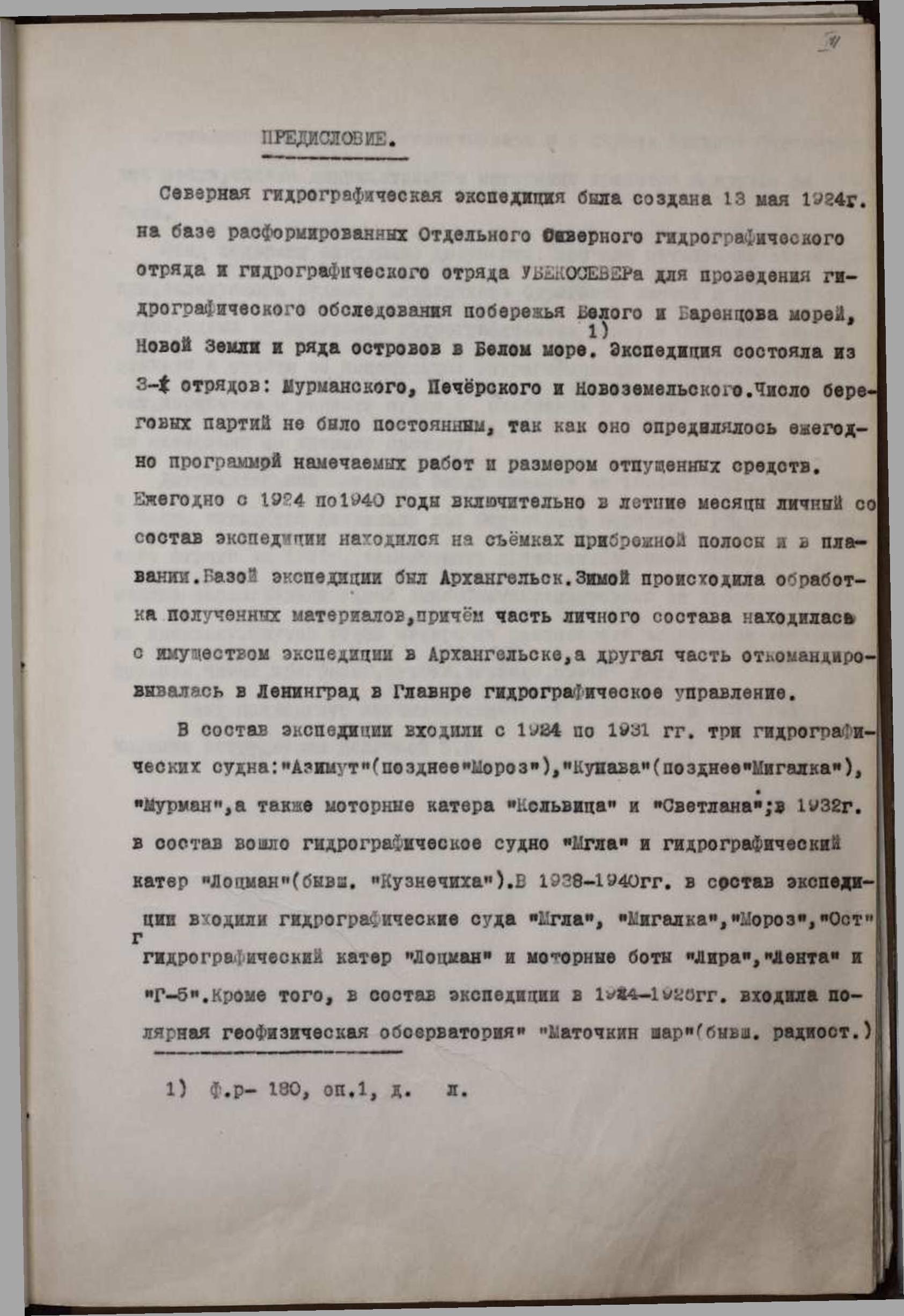 Северная гидрографическая экспедиция была создана 13 мая 1924 г. на базе расформированных Отдельного Северного гидрографического отряда и гидрографического отряда УБЕКОСЕВЕРа для проведения гидрографического обследования побережья Белого и Баренцова морей, Новой Земли и ряда островов в Белом море. 1). Экспедиция состояла из 3-х отрядов: Мурманского, Печорского и Новоземельского. Число береговых партий не было постоянным, так как оно определялось ежегодно программой намечаемых работ и размером отпущенных средств. Ежегодно с 1924 по 1940 годы включительно в летние месяцы личный со состав экспедиции находился на съёмках прибрежной полосы и в плавании. Базой экспедиции был Архангельск. Зимой происходила обработка полученных материалов,причём часть личного состава находилась с имуществом экспедиции в Архангельске,а другая часть откомандировывалась в Ленинград в Главное гидрографическое управление.