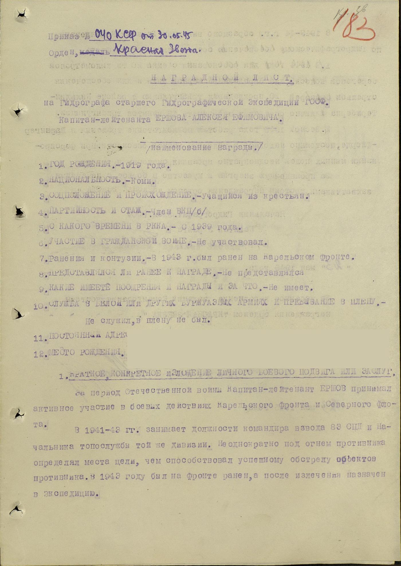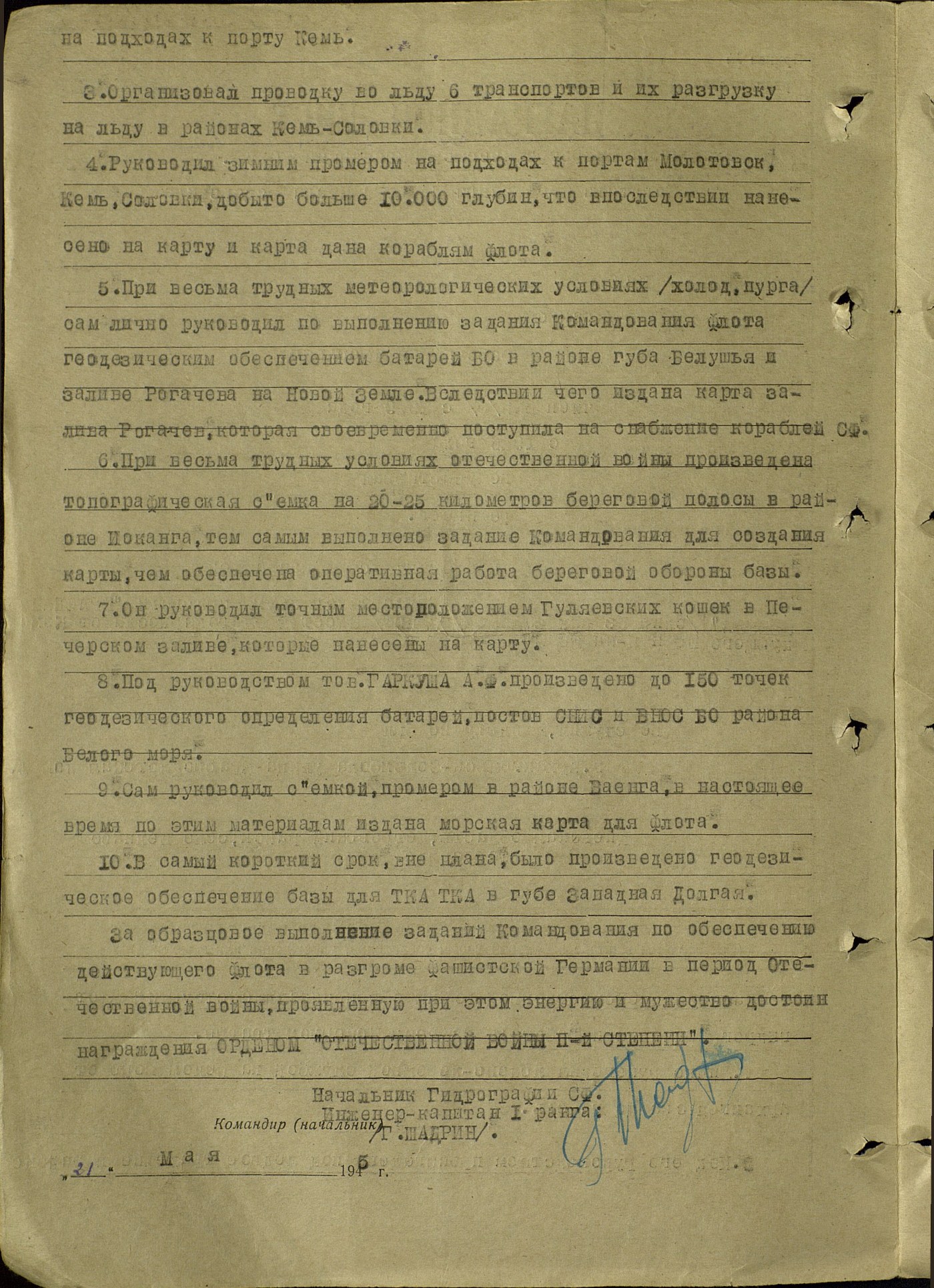 1. 1942 и 1943 г.г. по заданию Штаба С.Ф. производил топографическую съемку района Иоканкской военно-морской базы. Работал на пересеченной горной местности, будучи недостаточно обеспечен в материальном отношении по 10-16 часов в сутки.