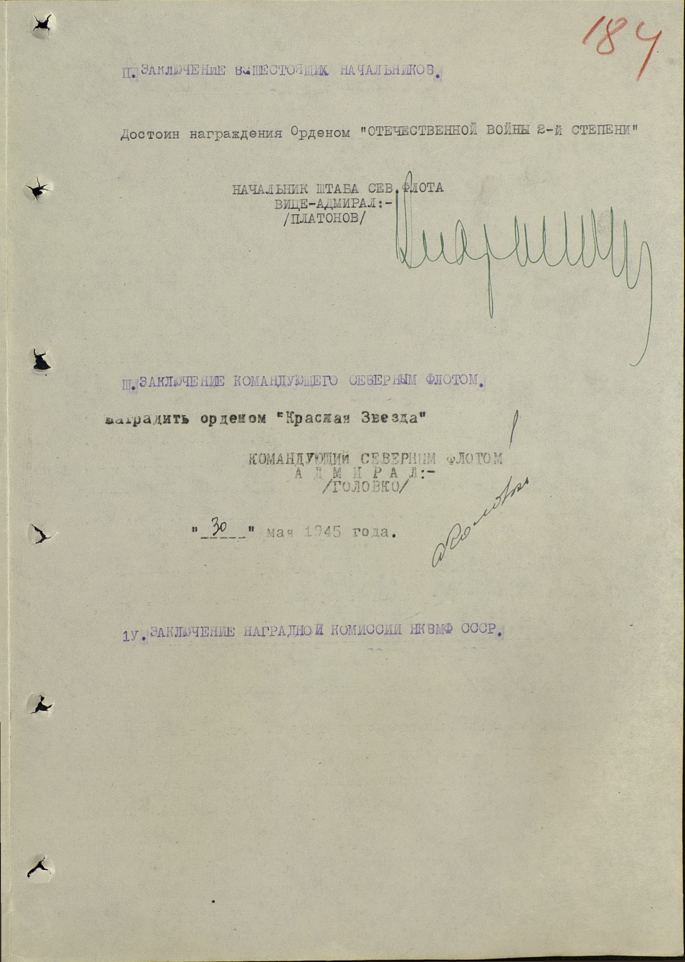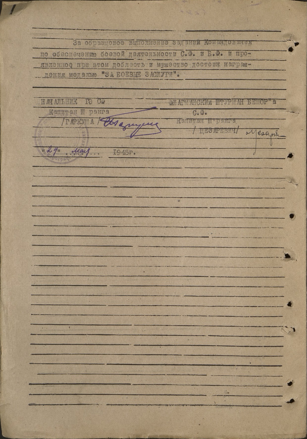За самоотверженную работу по гидрографическому обеспечению боевых объектов и кораблей Б.Ф. и С.Ф., образцовое выполнение оперативных и плановых заданий и проявленные при этом доблесть и мужество достоин награждения медалью "ЗА БОЕВЫЕ ЗАСЛУГИ".