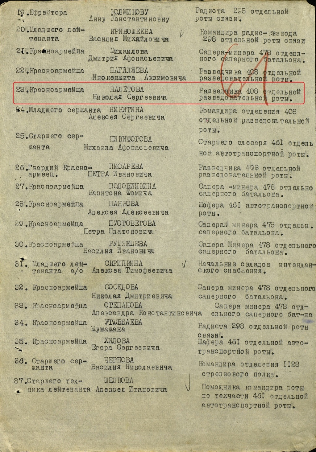 За период наступательных боев с 15 марта 1945 г. т. Налетов беспрерывно обеспечивал выбот наблюдательного пункта и вел наблюдение за движением и передним краем немцев. Особенно отличился т. Налетов 17 апреля 1945 г. Он получил задачу разведать высоту 304 и установить на ней наблюдательный пункт. Подойдя к высоте с четырьмя, приданными в его распоряжение, саперами, т. Налетов установил что на высоте находится боевое охранение противника. Т. Налетов, под прикрытием саперов, подполз к немецким пулеметчикам и гранатами забросал окоп в котором они находились. Три гитлеровца были убиты. Т. Налетов вскочил в окоп и огнем из пулемета прикрывал подход саперов. Немцы, пытаясь вернуть высоту, предприняли контратаку, но под командованием т. Налетова четыре сапера удержали высоту до подхода нашей пехоты. Достоин Правительственной награды орденом Отечественной войны II степени. Командир 408 отд.развед.роты Капитан [подпись] /Солнцев/ Достоин Правительственной награды орденом Отечественной войны II степени. Начальник разведотдела 336 стр. Житомир. ордена Суворова II ст. дивизии Капитан [подпись] /Пахомов/ "_" мая 1945 г.
