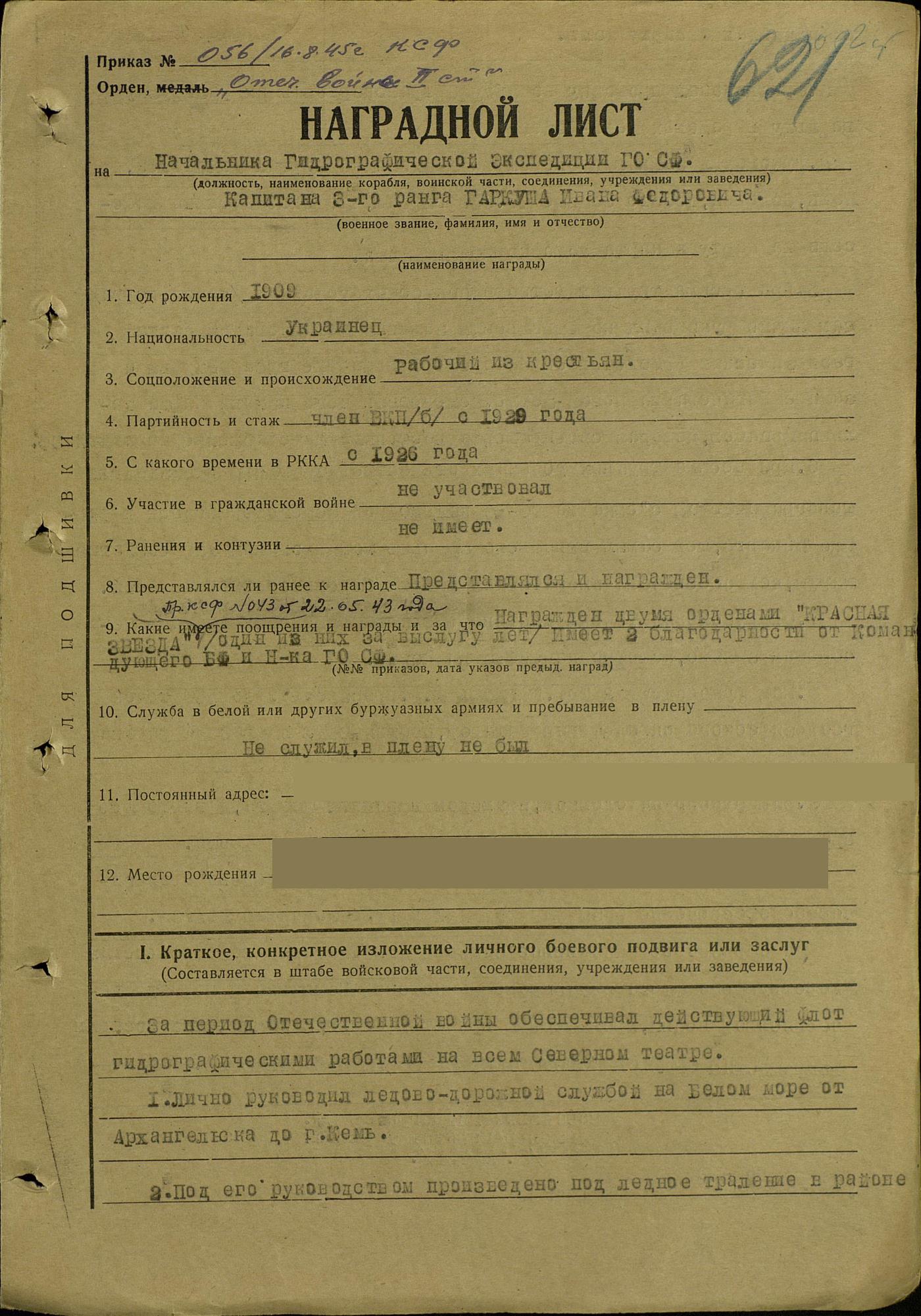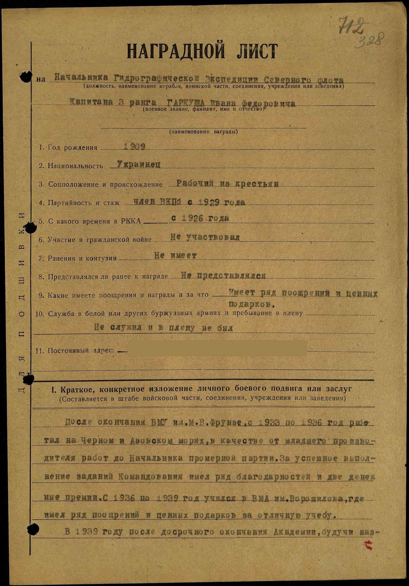 Капитан 3 ранга ГАРКУША ИВАН ФЕДОРОВИЧ энергичный и волевой офицер. Дисциплинированный, требовательный к себе и подчиненным. Обладает хорошими организаторскими способностями. В результате умелого руководства подчиненными, часть капитана 3 ранга Гаркуша, успешно оправляется с задачами по гидрографическому обеспечению боевой деятельности Сев. Флота. На 7 ноября 1944 года прослужил в КА и ВМФ 18 лет.